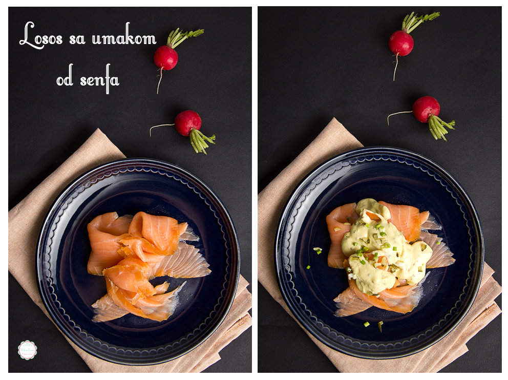 Za dve osobe vam je potrebno: 200g dimljenog lososa, 1 manji crni luk, 1 manji kiseli krastavac, 90ml kisele pavlake, 2 kašike vinskog sirćeta, 2 kašike maslinovog ulja, 2 kašike senfa od celog zrna slačice (ili običnog), 1 kašika smeđeg šećera i soli i bibera po potrebi.