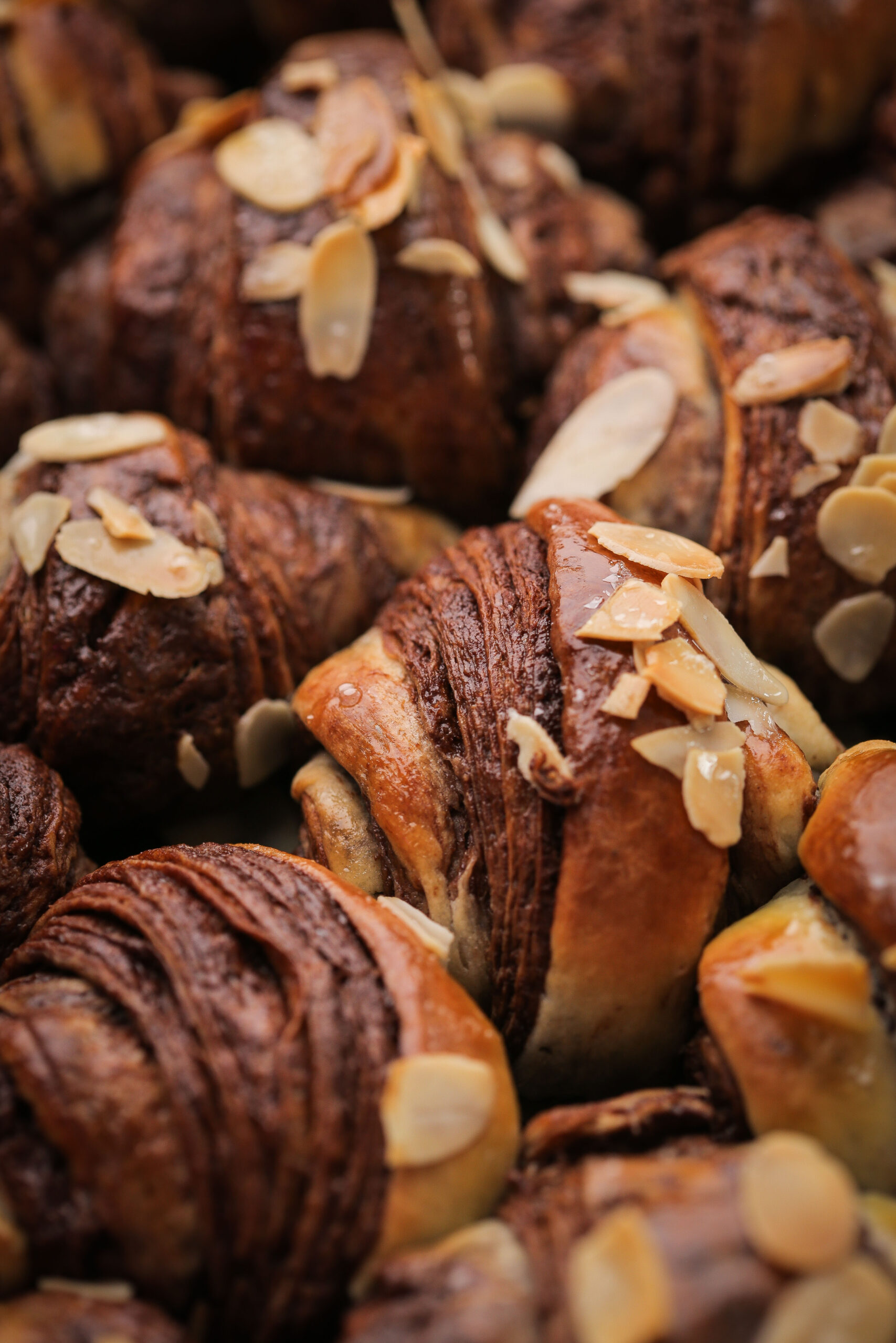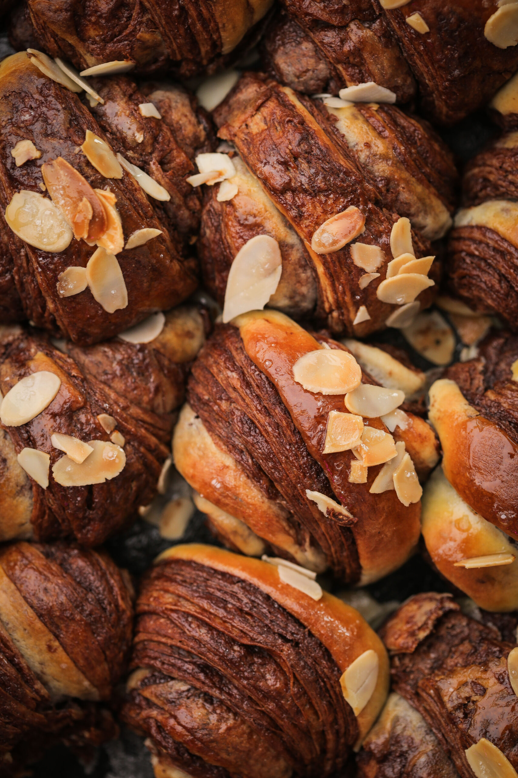 Naraslo testo premesite pa ga na pobrašnjenoj radnoj površini rastanjite na veliki pravougaonik. Premažite celu površinu testa filom, pa preklopite ka sredini jednu stranu testa a zatim nju preklopite drugom stranom testa. Pritisnite malo pa na dve trećine dužine testa nanesite još fila. Preklopite opet jedan kraj preko drugog, pritisnite prstima da se slojevi sjedine pa na pobrašnjenoj radnoj površini rastanjite oklagijom na manji pravougaonik. Dve trećine testa premažite filom, pa ponovo preklopite testo ka sredini, jedan kraj preko drugog. Za kraj, ukoliko vam je ostalo još malo fila, namažite ga na polovinu testa, preklopite još jednom. Da naglasim, cela poenta preklapanja je da svaki sloj testa bude prekriven filom. Manje je važan redosled, više je važno da (čak i na svoj način) ispreklapate testo tako da ima što više slojeva. Ne opterećujte se previše jer će svakako biti sjajno.
