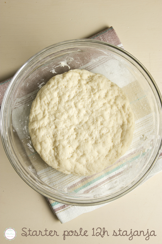 Veče pre napravite starter: kvasac razmutite u toplov vodi pa sa brašnom zamesite tvrđe testo. Ostavite u velikoj blago nauljenoj posudi da prenoći, pokriveno plastičnom folijom. Jubistacha kaže da je potrebno od 8 do 10 sati, ja sam ga držala i duže (ne namerno, već nisam stigla ranije).