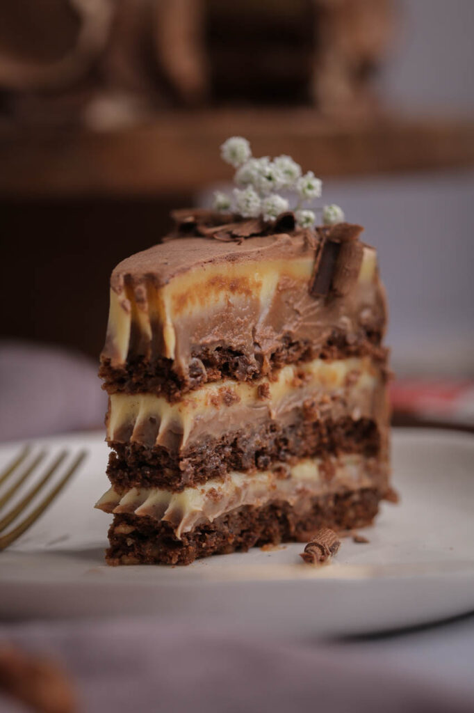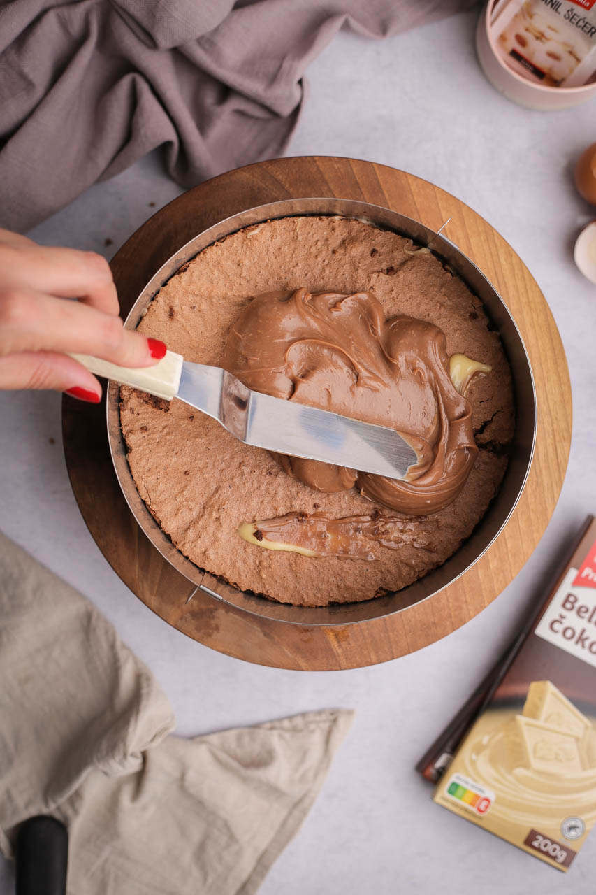 Kada se ohladio fil i kada su se ohladile kore, nafilujte tortu. Fil je mekši, pa će vam trebati prsten za filovanje torte. Ako nemate prsten, možete koristiti neki od kalupa za pečenje sa odvojivim dnom. Na jednu koru prvo stavite tamni a zatim istukoličinu svetlog fila. Poklopite korom, pa nastavite redom. Tortu završite svetlim filom i ostavite u frižideru da se stegne preko noći.