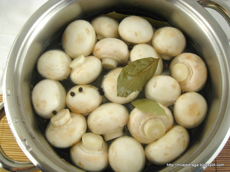 Oprane šampinjone sa mlekom, biberovim zrnima i lovorovim listom kuvajte oko 20 minuta. Kada su skuvani, ocedite ih i ostavite da se malo ohlade. Secite ih na četvrtine pa začinite solju, biberom, peršunom, belim lukom, sirćetom i uljem. Ja volim da ima dosta ulja, dosta svežeg peršuna i onako skoro pa dosta belog luka 🙂 Ohladite ih ili ih jedite vruće uz meso ili uz bilo šta drugo 🙂
